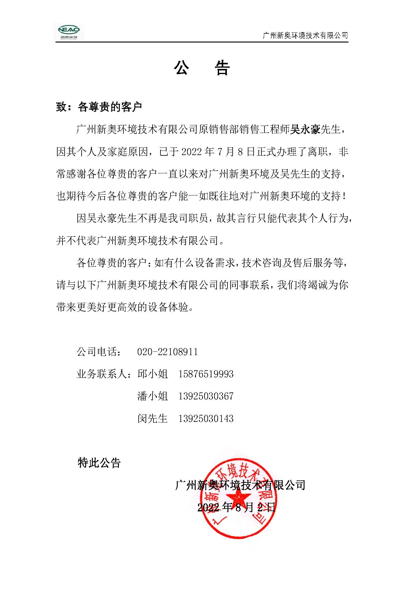 公告(吴永豪离职)